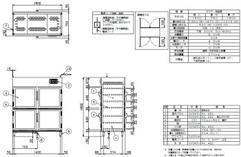 ガラス・両面扉 【外形寸法】間口1500×奥行750×高さ1800mm 【庫内有効寸法】間口1350×奥行670×高さ1215mm 【庫内ヒーター】4.8kW 【加湿ヒーター】1.2kW 【ファンモーター】0.2kW 【電源】3相200V 50/60Hz 【消費電力】6.2kW 【加湿器給水口】15A 【排水口】25A 【必要手元開閉器容量】20A ※減圧逆止弁、固定金具は標準付属品です。