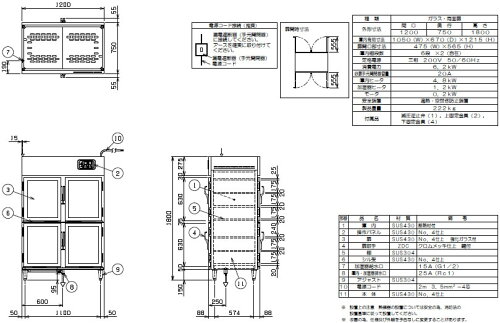 ガラス・両面扉 【外形寸法】間口1200×奥行750×高さ1800mm 【庫内有効寸法】間口1050×奥行670×高さ1215mm 【庫内ヒーター】4.8kW 【加湿ヒーター】1.2kW 【ファンモーター】0.2kW 【電源】3相200V 50/60Hz 【消費電力】6.2kW 【加湿器給水口】15A 【排水口】25A 【必要手元開閉器容量】20A ※減圧逆止弁、固定金具は標準付属品です。