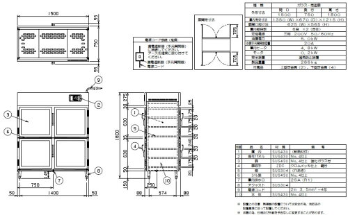 ガラス・両面扉 【外形寸法】間口1500×奥行750×高さ1800mm 【庫内寸法】間口1350×奥行670×高さ1215mm 【庫内ヒーター】4.8kW 【ファンモーター】0.2kW 【電源】3相200V 50/60Hz 【消費電力】5.0kW 【庫内排水口】25A 【必要手元開閉器容量】20A ※固定金具は標準付属品です。