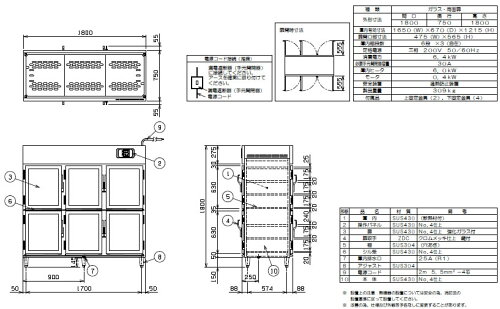 ガラス・両面扉 【外形寸法】間口1800×奥行750×高さ1800mm 【庫内寸法】間口1650×奥行670×高さ1215mm 【庫内ヒーター】6.0kW 【ファンモーター】0.4kW 【電源】3相200V 50/60Hz 【消費電力】6.4kW 【庫内排水口】25A 【必要手元開閉器容量】30A ※固定金具は標準付属品です。